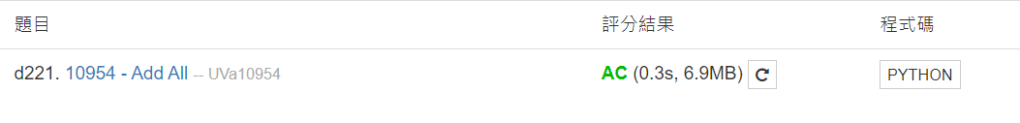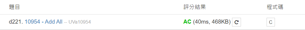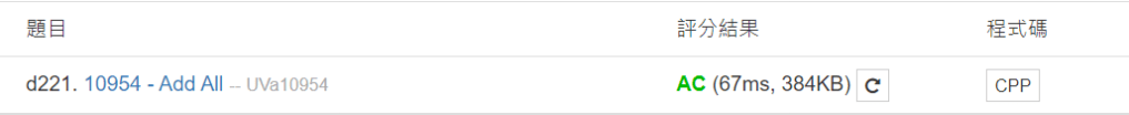 解題想法 : 。C/Python - 排序,之後每次取出前兩項(最小兩個)相加,並使用二分搜找到放回的點,重覆實作直到剩下一項為止,過程紀錄ans。 。C++/Python - 每次拿最前面兩個數相加後放回priority_queue/heapq,直到剩下一個為止,過程記錄ans
