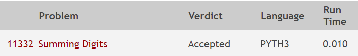 解題想法 : 首先定義一個函數f(s),用於遞迴計算答案。(s為輸入字串) 當輸入的字串長度 = 1 時,結束f(s)。 否則遞迴呼叫f(Sum(s))。 其中函數Sum(s)需要另外定義,用於計算字串各位數相加結果。(注意 : 首先會讀入字串,並將各位數轉成整數並相加求出總和,最後再將總和轉回字串型態。(C可用sprintf(), C++可用std::to_string() or stringstream, Python可用str())) 如此一來即可解決此題。