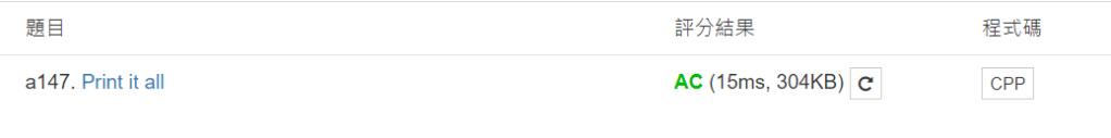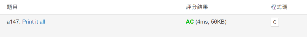 來源 : https://zerojudge.tw/ShowProblem?problemid=a147 出題者 : 雄中公假社 標籤 : 窮舉法 難易度 : 1