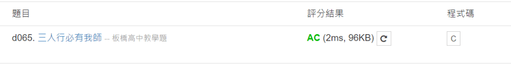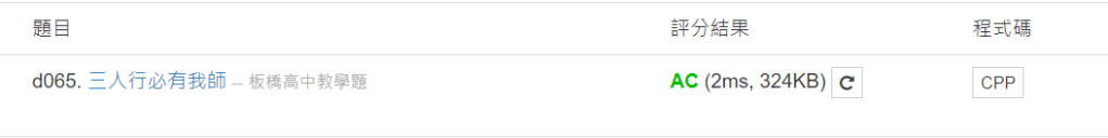 解題想法 : 此題可以用單純的if來實作,亦可直接使用max()函式來完成(C語言需另外定義max(a,b),可使用函數宣告或巨集) 注意事項 : C++中提供的max()函式只接受一次比較兩個數,因此不能像Python一樣直接寫max(a,b,c),實作上可以先比較b,c求出較大值,在拿它去和a比,實際寫成程式碼會像這樣 : max(a, max(b, c)) 關於巨集(macro)的說明 : http://kaiching.org/pydoing/cpp/cpp-macro.html