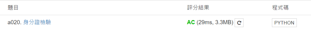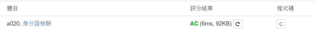 解題想法 : 此題和「a054: 電話客服中心」類似,詳細作法可參考此篇題解,重複的部分便不再贅述。(https://test36047.wordpress.com/2022/11/29/a054-%e9%9b%bb%e8%a9%b1%e5%ae%a2%e6%9c%8d%e4%b8%ad%e5%bf%83/) 和a054不同之處在於,我們這次直接算好每個字母對應的兩位數該轉成的數值,例如A=10,就先算好(1*1)+(0*9)=1,故d['A']=1,以此類推。 其餘實作部分建議可參考a054。(若了解實作原理,基本上可以一次解決掉此題和a054。)