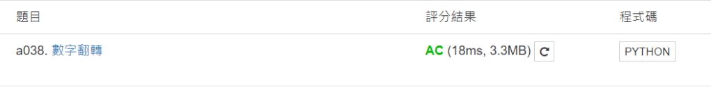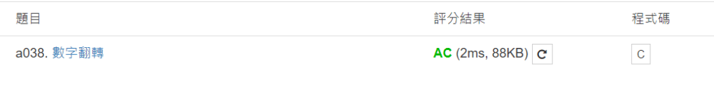 解題想法 : 。C - 迴圈 跑一個for i,從(字串長-1)走回0,即為反轉,而如何忽略前面多餘的0,我們可以照a034的老套路來實作,詳細可參考a034的題解(https://test36047.wordpress.com/2022/12/05/a034-%e4%ba%8c%e9%80%b2%e4%bd%8d%e5%88%b6%e8%bd%89%e6%8f%9b/) 要注意的地方是,正式測資中有一個case是00000...00,這時如果按照a034的做法的話會完全沒有輸出,解決辦法是,因為我們知道一定會有輸出,所以flag無論如何最後應該要變成1(true),因此我們可以在做完for i後另外判斷flag,若為0(false)則直接輸出0。 。C++ - reverse()+stringstream 首先將輸入字串用reverse()直接翻轉,再來將反轉後的字串丟入stringstream,再把stringstream倒進一個整數變數內,即可自動將前面不必要的0給去除。 (stringstream詳細用法&轉整數方法參考 : https://home.gamer.com.tw/creationDetail.php?sn=4114818) 。Python - reversed()+str.join() 首先將輸入字串用reversed()反轉,由於reversed()回傳的是list,因此可以利用''.join(reversed())的方式把reversed()回傳的list轉成str型態,再來即可使用int()把它轉成整數,並自動將前面不必要的0去除。