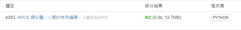 來源 : https://zerojudge.tw/ShowProblem?problemid=e283 出題者 : 2018年6月APCS 標籤 : 建表查表、字串拼接、IO加速 難易度 : 1