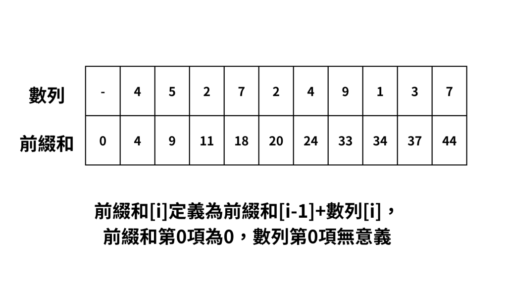 所謂前綴和,是指對一個數列進行累加,並儲存於一個陣列中,對於一個位置k,前綴和的第k項就是數列第1項到第k項的加總,定義如下圖 (根據不同題目,定義的方式會有小差異,但觀念上是相等的)。