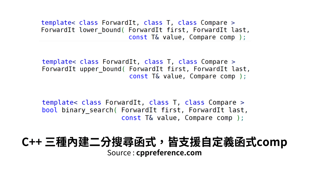 C++內建的二分搜尋函式支援使用自定義函式來控制想得到的值,而搜出來的結果會是從左邊數到右邊第一個使comp函式回傳false的那個選項,詳細請參考下列投影片。