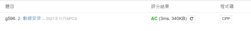 來源 : https://zerojudge.tw/ShowProblem?problemid=g596 出題者 : 2021年11月APCS 標籤 : 模擬法 難易度 : 2