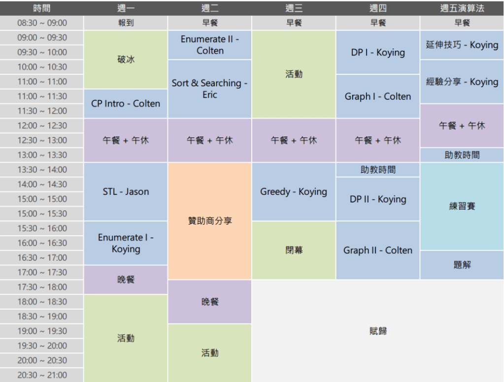 寒訓分為前面三天的聯合寒訓,和後兩天的延伸課程與模擬賽,並分成了演算法與資安兩種領域,我則選擇了演算法,且由於後兩天的課程較有深度,所以我總共待了完整的五天。
